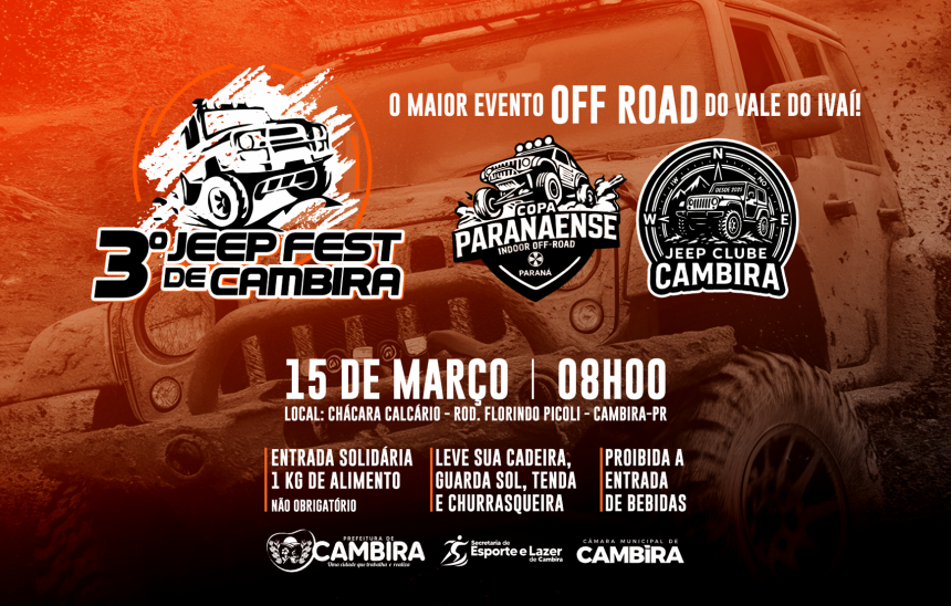O evento é promovido pelo Jeep Clube Cambira, com apoio da Prefeitura de Cambira, da Secretaria Municipal de Esporte e Lazer e da Câmara Municipal, e contará também com etapas da Copa Paranaense Indoor Off-Road, trazendo competidores de diversas cidades da região e do estado.