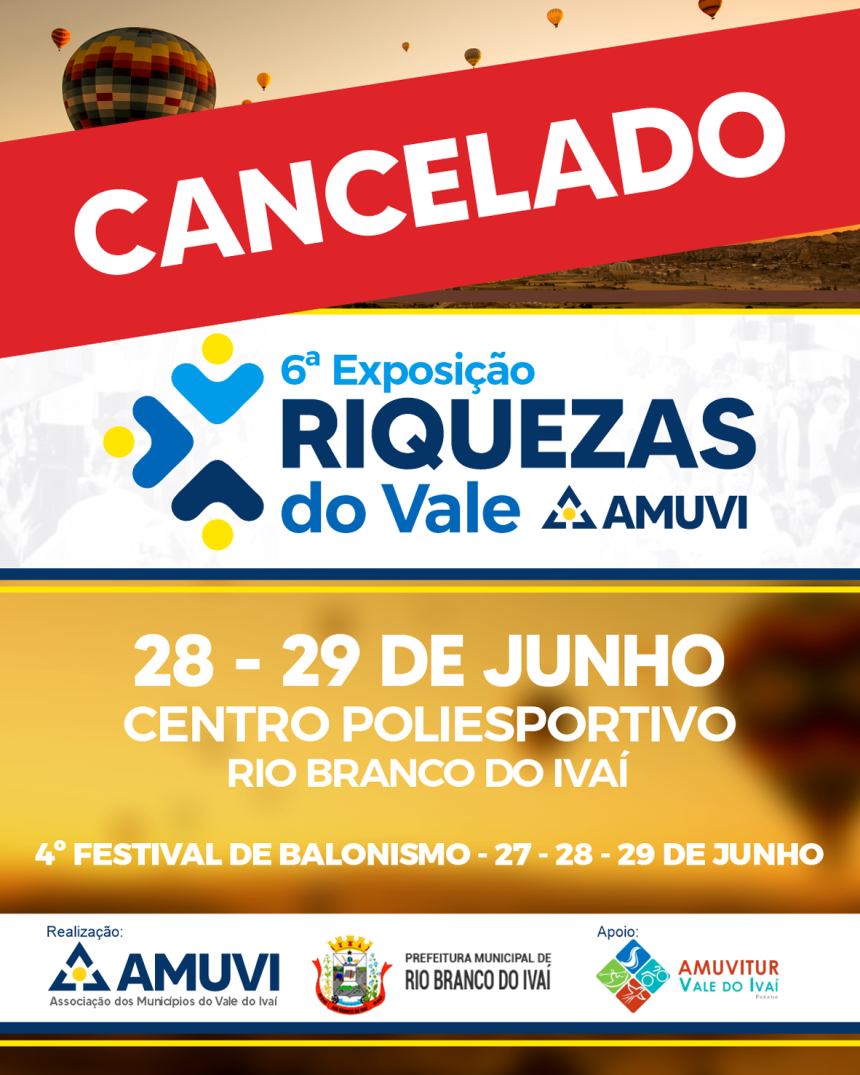 A Associação dos Municípios do Vale do Ivaí (AMUVI) anunciou oficialmente o cancelamento da 6ª Exposição Riquezas do Vale, que seria realizada nos dias 28 e 29 de junho, no Centro Poliesportivo de Rio Branco do Ivaí. O 4º Festival de Balonismo, programado para os dias 27, 28 e 29, também foi cancelado.