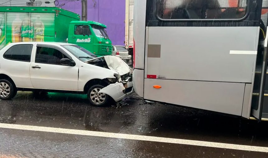 Um acidente envolvendo um carro e um ônibus do transporte coletivo foi registrado na manhã do dia 12, por volta das 7h30, na Avenida Minas Gerais, no Jardim Apucarana, próximo ao Posto Brasil Sul II. O veículo Fiat Palio bateu na traseira do ônibus e ficou bastante danificado.