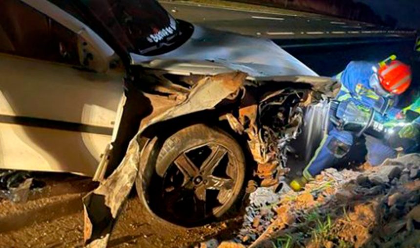 Após o impacto, o carro foi encontrado abandonado no local. Equipes da Defesa Civil estiveram na área para sinalizar a via.