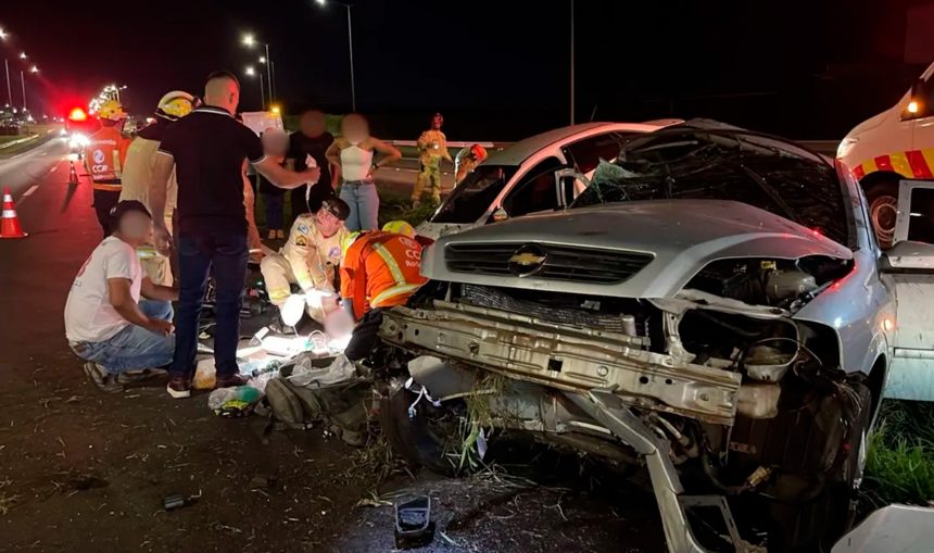 Inicialmente, a ocorrência envolveu um Ford Focus ocupado por um casal e uma criança de 2 anos. O veículo caiu em uma canaleta ao acessar a alça de retorno no sentido Arapongas.