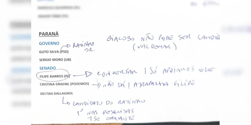 Outros dois nomes aparecem como possibilidades: Cristina Graeml (União Brasil), que, segundo a anotação, “atrapalharia Filipe”; e o ex-deputado Deltan Dallagnol (Novo), que é apontado como “candidato do Ratinho e primeiro nas pesquisas”.