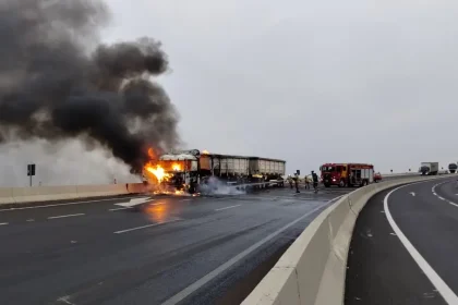 Caminhão carregado de açúcar pega fogo no Contorno de Jandaia do Sul