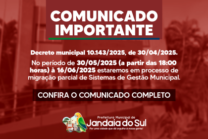 Comunicado Importante: Site e Sistemas da Prefeitura de Jandaia do Sul ficarão indisponíveis de 01 a 15 de junho; Confira