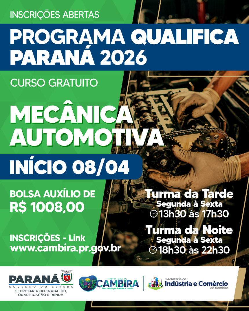 A Prefeitura de Cambira, por meio da Secretaria de Indústria e Comércio, está com inscrições abertas para o curso gratuito de Mecânica Automotiva, oferecido através do programa Qualifica Paraná 2026, do Governo do Estado.
