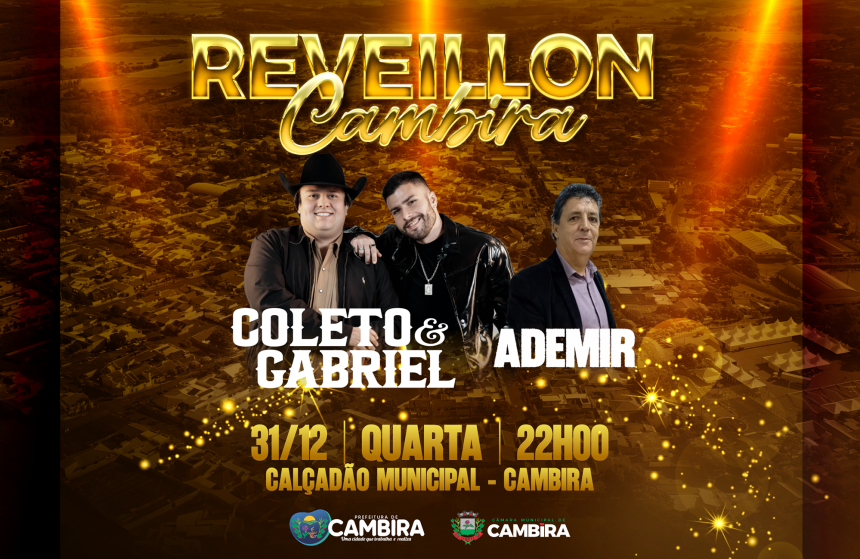 A noite contará com a apresentação de Ademir, a partir das 22h00. E show com Coleto & Gabriel a partir das 23h30. As atrações que prometem animar o público e marcar a virada do ano com um repertório diversificado. A iniciativa é promovida pela Prefeitura de Cambira, com apoio da Câmara Municipal.