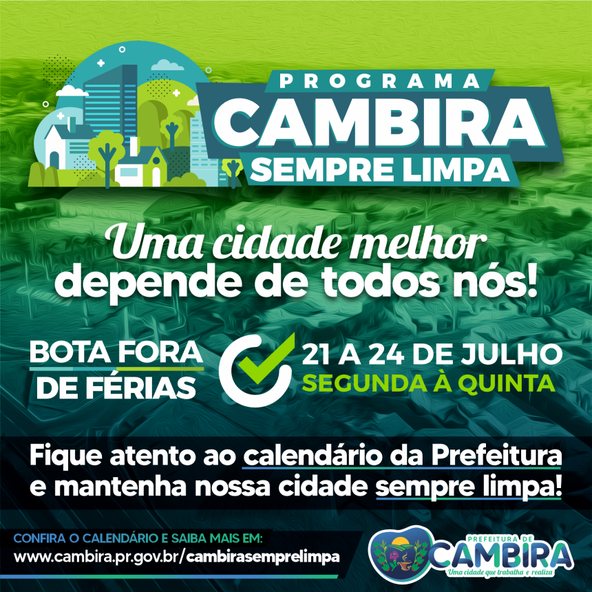 A Prefeitura de Cambira promove na próxima semana, de 21 a 24 de julho, mais uma edição do Programa Cambira Sempre Limpa, iniciativa que tem como objetivo reforçar a limpeza urbana e o cuidado com o meio ambiente. Durante o período, será realizado o Bota Fora de Férias, ação que mobiliza a coleta de entulhos e materiais descartáveis deixados em frente às residências.