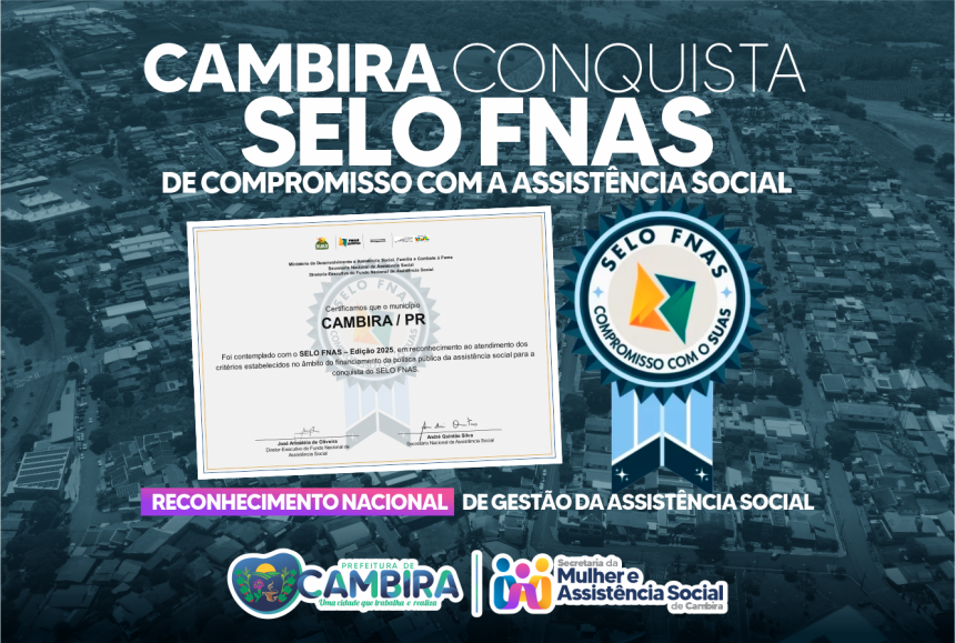O município de Cambira foi reconhecido em nível nacional com a conquista do Selo FNAS – Edição 2025, concedido pelo Ministério do Desenvolvimento e Assistência Social, Família e Combate à Fome. A certificação destaca o cumprimento de critérios relacionados à gestão e ao financiamento da política pública de assistência social.