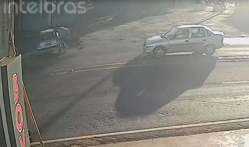 Uma câmera de segurança flagrou o momento em que uma motocicleta colidiu contra um carro na Avenida Minas Gerais, próximo ao Supermercado Econômico, em Apucarana (PR). O acidente ocorreu às 7h46 desta quinta-feira (14).