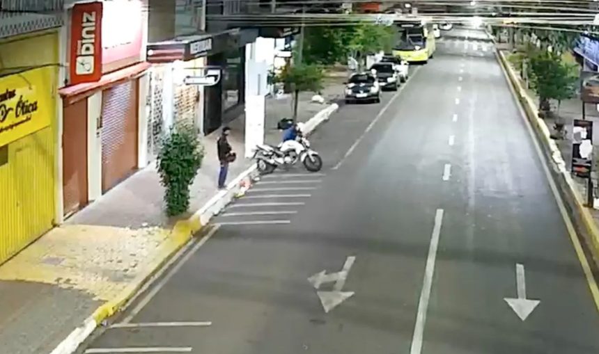 As imagens mostram os suspeitos caminhando até o veículo. Um deles liga a moto rapidamente, enquanto o outro coloca os capacetes e ambos fogem em seguida.