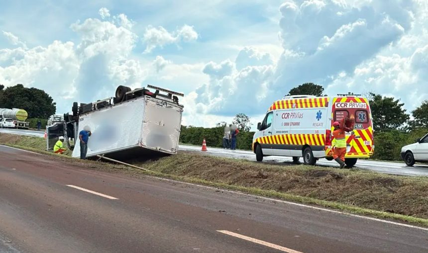 Um caminhão-baú capotou no km 229 da BR-376, sentido Apucarana a Cambira, na tarde desta segunda-feira (22), nas proximidades do Distrito do Pirapó.