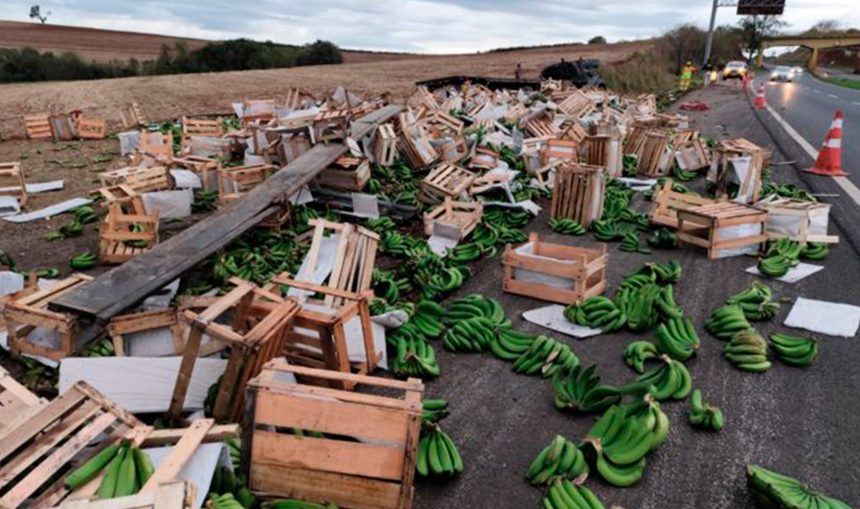 Um caminhão carregado com bananas tombou na manhã desta quarta-feira (5) na BR-376, em Cambira. O acidente aconteceu por volta das 6h, em frente à rodoviária da cidade, nas proximidades do trevo de acesso ao município.