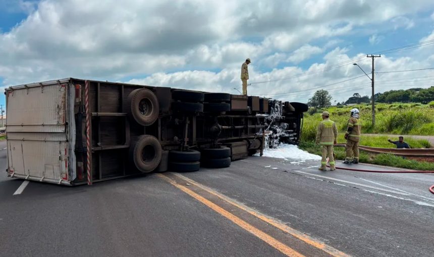 Um caminhão carregado com móveis tombou na PR-444, na altura do quilômetro 3, em Arapongas, após o motorista perder o controle da direção e sair da pista. O acidente foi registrado na manhã do dia 16 e mobilizou equipes do Corpo de Bombeiros devido a um vazamento de combustível no local.
