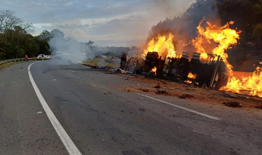 Um caminhão carregado com líquido inflamável pegou fogo na tarde desta segunda-feira (4), no km 421 da BR-376, em Tibagi, nos Campos Gerais do Paraná.