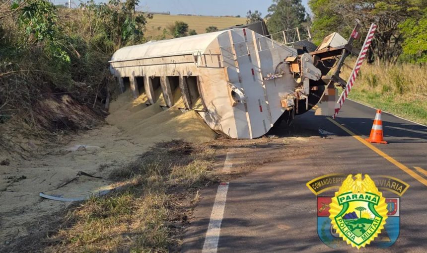 O caminhão tombou para o lado esquerdo da rodovia, espalhando a carga às margens da pista. As causas do acidente estão sendo investigadas.
