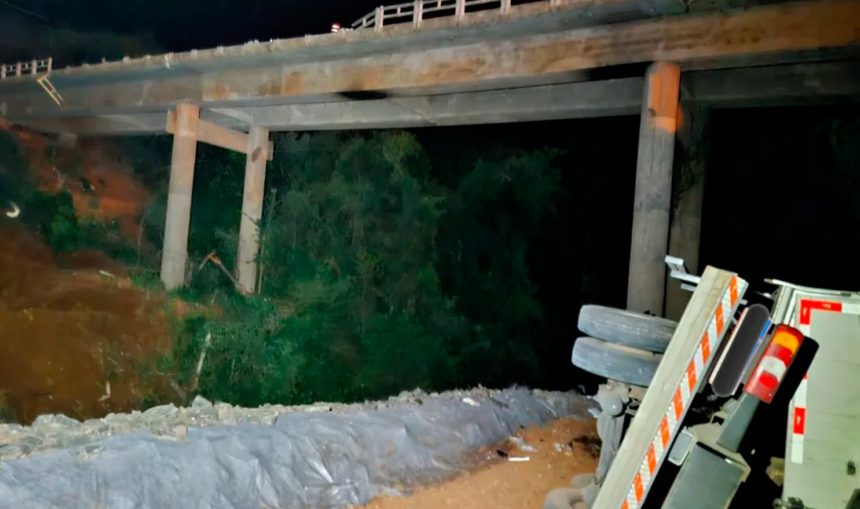 O veículo colidiu contra a proteção lateral de uma ponte, rompeu a barreira de contenção e caiu de uma altura elevada, atingindo o solo abaixo da estrutura.