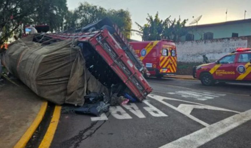 Um caminhão tombou na manhã desta quinta-feira (21) no cruzamento da Rua São Salvador com a Avenida Rafael Sorpile, no Jardim Marissol, em Apucarana. O veículo acabou atingindo o muro de uma residência e causou estragos no local.