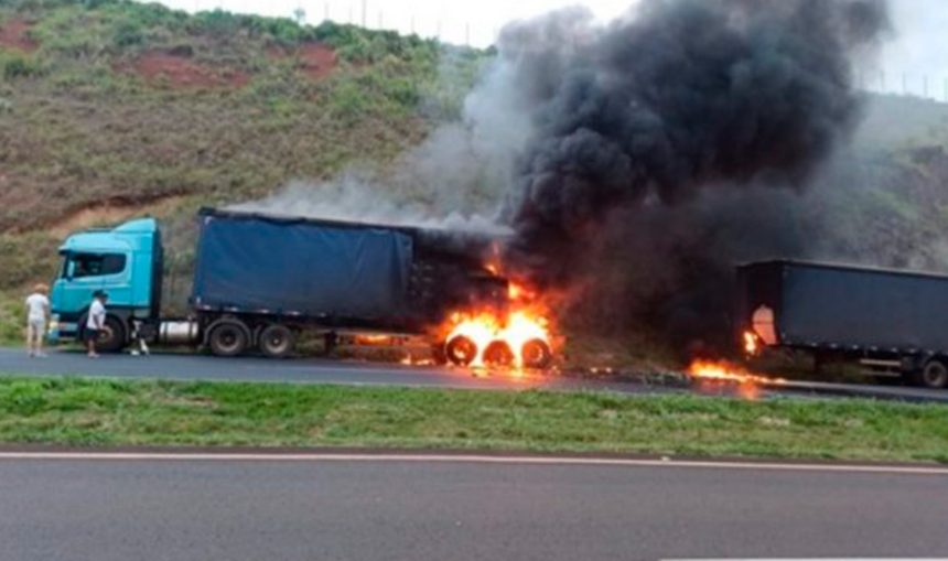 Uma carreta bitrem carregada com bebidas pegou fogo no contorno de Mandaguari no final da tarde de domingo (21).