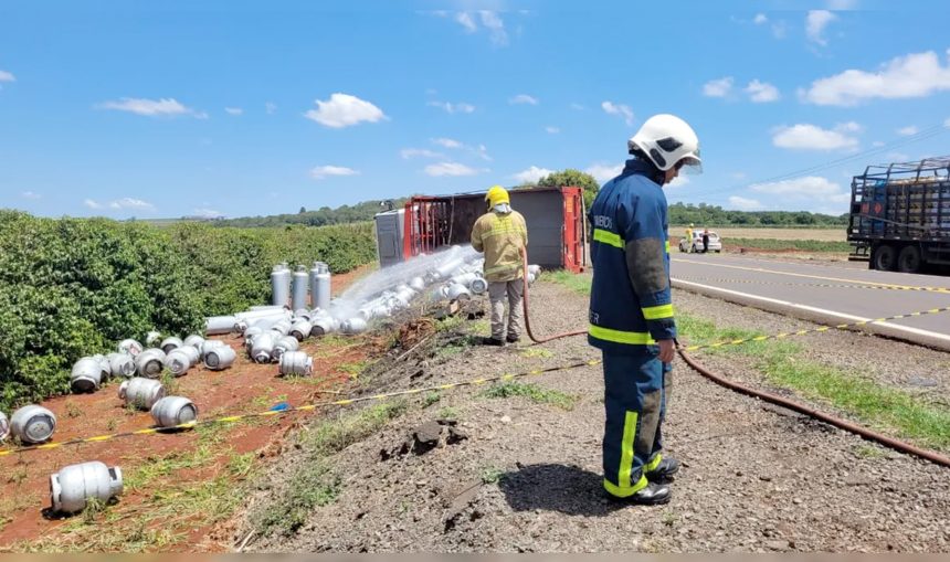 Uma carreta que transportava botijões de gás tombou na PR-170, entre o distrito do Pirapó e Arapongas, na manhã desta terça-feira. O motorista perdeu o controle e o veículo capotou, espalhando a carga pelo acostamento.