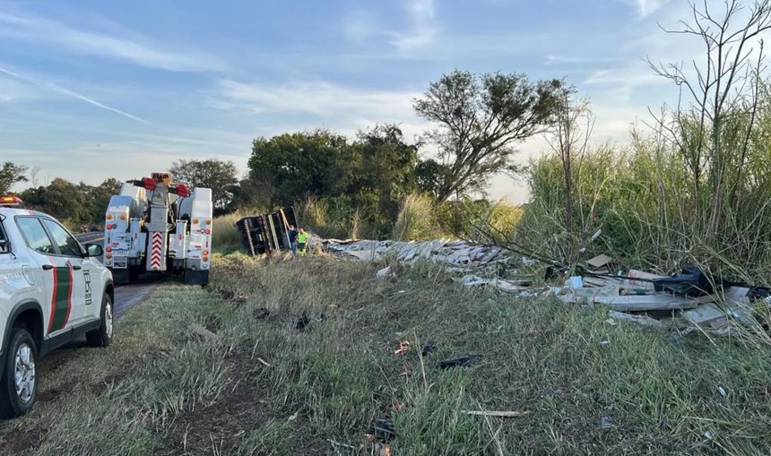 Uma carreta carregada com móveis tombou na curva da PR-444, em Arapongas, na tarde deste sábado (2). O veículo seguia de Arapongas para Maceió, capital de Alagoas, quando o motorista perdeu o controle na curva, ocasionando o acidente. Parte da carga ficou espalhada às margens da rodovia.