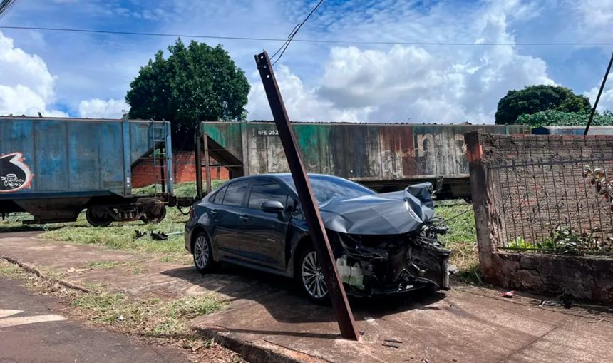 Um Toyota Corolla foi atingido na passagem de nível da Rua Hermes da Fonseca, na região do Jardim Trabalhista, e chegou a ser arrastado por alguns metros pela composição.