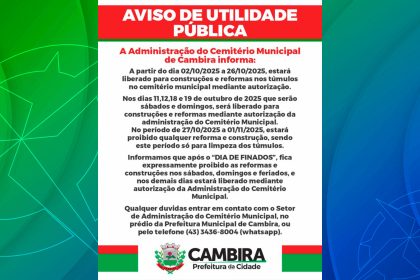 A Administração do Cemitério Municipal de Cambira informou que, entre os dias…