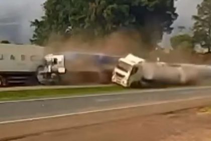 Um acidente envolvendo três carretas foi registrado por uma câmera de segurança…