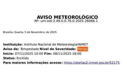O Instituto Nacional de Meteorologia (INMET) emitiu um alerta de perigo para…
