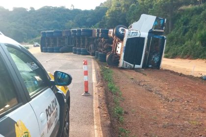 Colisão entre caminhões provoca tombamento na PR-466 entre Pitanga e Boa Ventura de São Roque
