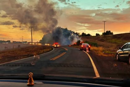 Van pega fogo na PR-082 em São João do Ivaí e mobiliza equipes de emergência