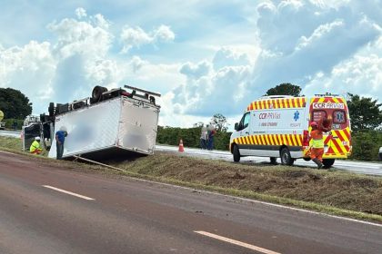 Caminhão-baú capota na BR-376 em Apucarana