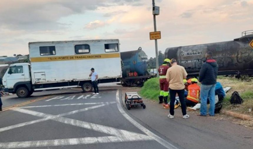 O caminhão, com placas de Bom Sucesso, transportava trabalhadores quando foi atingido na parte traseira pela locomotiva.