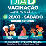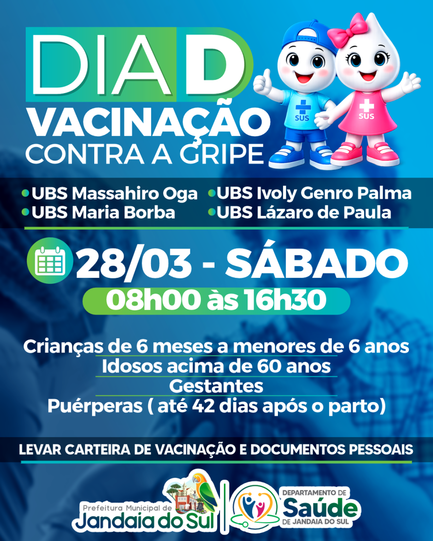 A Prefeitura de Jandaia do Sul, por meio do Departamento de Saúde, realiza neste sábado (28) o Dia D de Vacinação contra a gripe. A ação será das 8h às 16h30 nas UBS Massahiro Oga, Maria Borba, Ivoly Genro Palma e Lázaro de Paula.