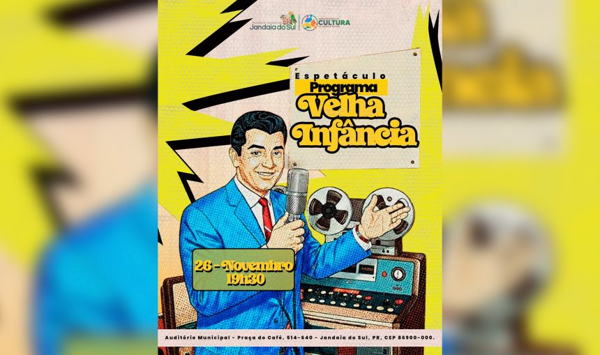 A Prefeitura de Jandaia do Sul, por meio do Departamento de Cultura, realizará no dia 26 de novembro, às 19h30, o espetáculo “Programa Velha Infância”, uma apresentação que promete transportar o público para momentos marcantes do passado.