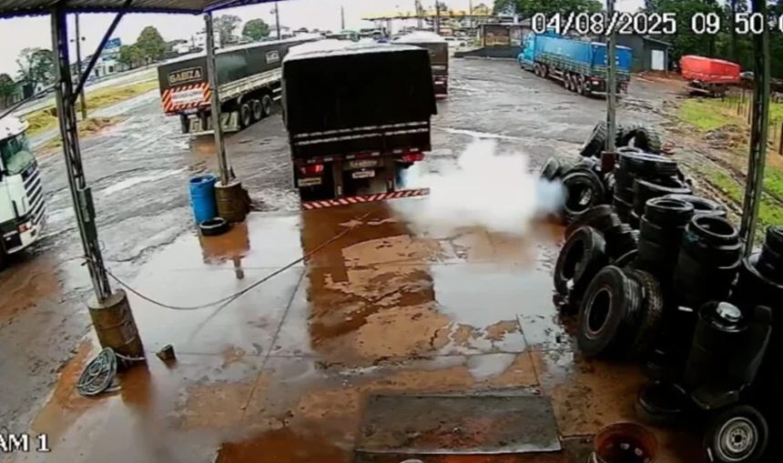 Segundo informações, o trabalhador se afastou momentaneamente para tirar a blusa ao sentir calor. Nesse intervalo, o pneu explodiu com violência, lançando peças e detritos por todo o local. O incidente foi registrado em vídeo, que mostra a força da explosão.