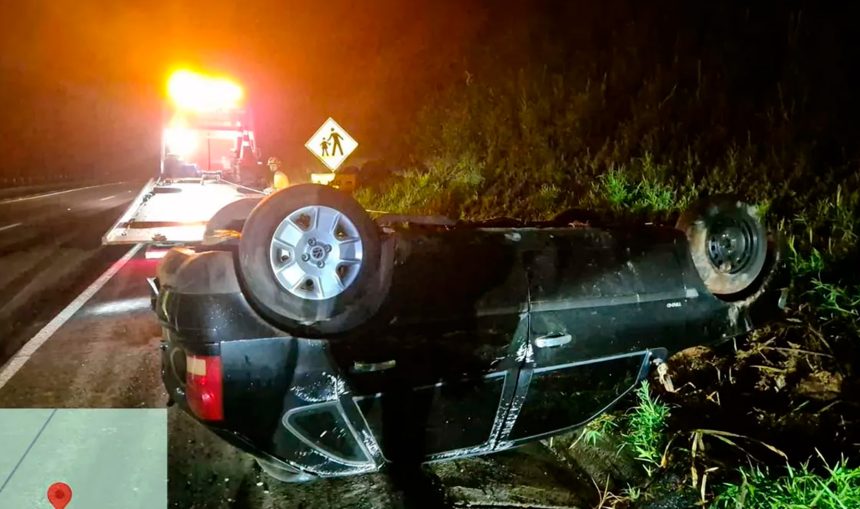 Após perder o controle, o carro saiu da pista, capotou e parou no acostamento da rodovia.
