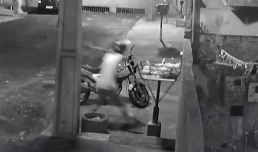 A ação foi registrada por câmeras de segurança, que mostram o suspeito chegando de motocicleta à residência da vítima, descendo com o machado em mãos e golpeando uma lixeira na calçada antes de entrar no imóvel.