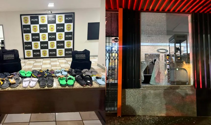 Um homem foi preso em flagrante na madrugada do dia 12 após arrombar uma loja de calçados na Avenida Curitiba, no centro de Apucarana. Ele quebrou a vitrine para entrar no local e tentou levar cerca de 15 pares de chinelos, além de uma camiseta e R$ 840 em dinheiro.