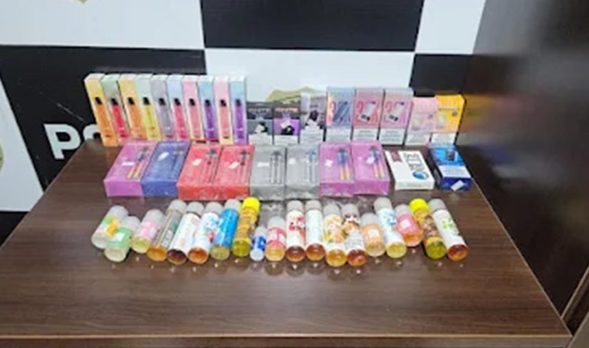 A ação ocorreu após denúncia anônima recebida pelo 181. Ao chegar a um estabelecimento comercial na Rua José Canteri, os agentes encontraram diversas caixas de cigarros eletrônicos próximas ao caixa, além de um depósito anexo com outras unidades, totalizando 28 caixas de produtos de diferentes marcas e 19 caixas de refis.