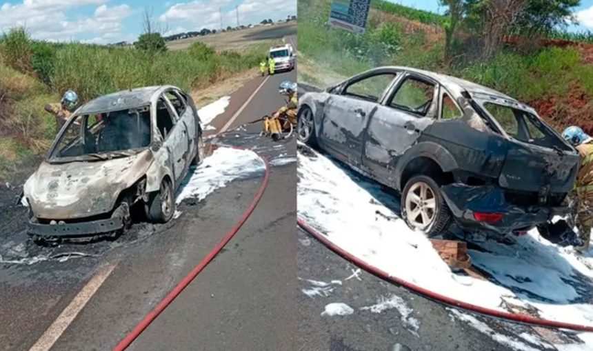 Um carro foi completamente destruído por um incêndio no final da manhã do dia 29, no km 24 da PR-444, nas proximidades do Distrito Caixa de São Pedro, em Apucarana.