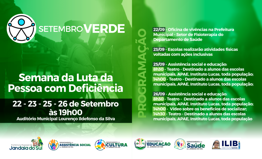 Entre os dias 22, 23, 25 e 26 de setembro, Jandaia do Sul promove a Semana da Luta da Pessoa com Deficiência, com programação no Auditório Municipal, sempre a partir das 19 horas.