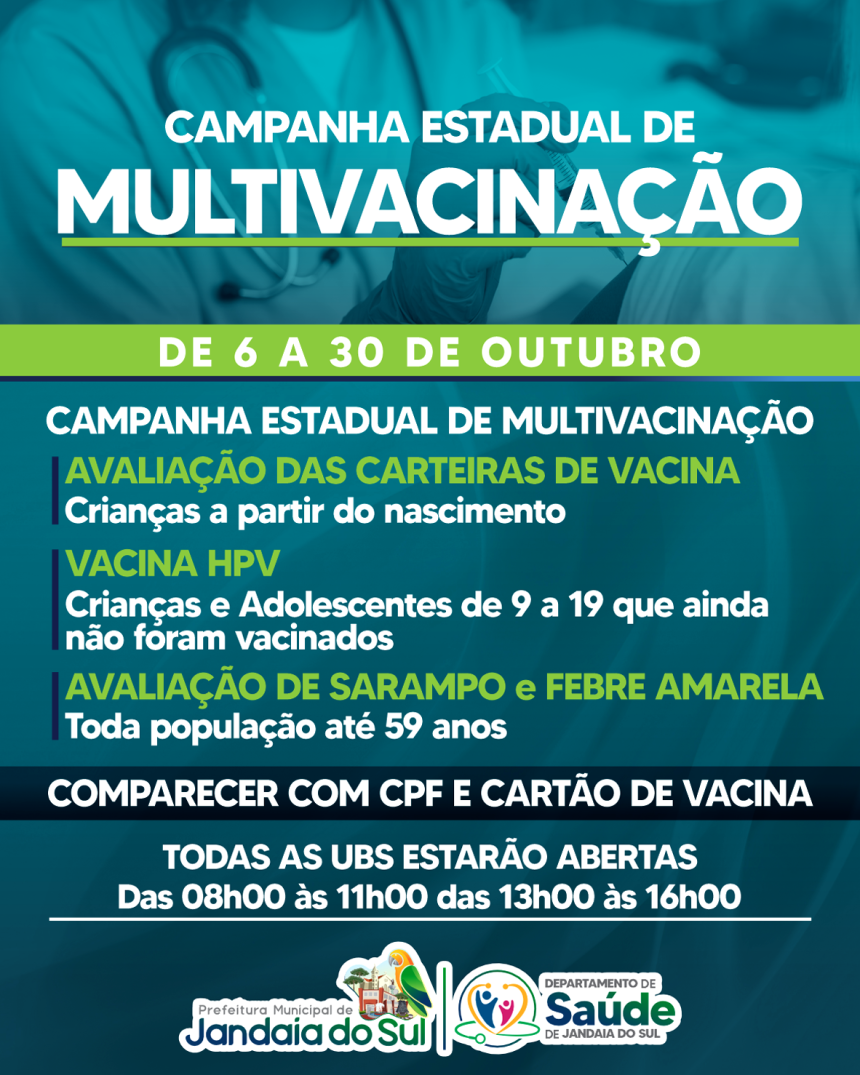 A Prefeitura Municipal de Jandaia do Sul, por meio do Departamento de Saúde, aderiu à Campanha Estadual de Multivacinação, que acontece de 6 a 30 de outubro em todas as Unidades Básicas de Saúde (UBS) do município. A ação tem como objetivo atualizar as carteiras de vacinação e garantir a proteção da população contra diversas doenças.