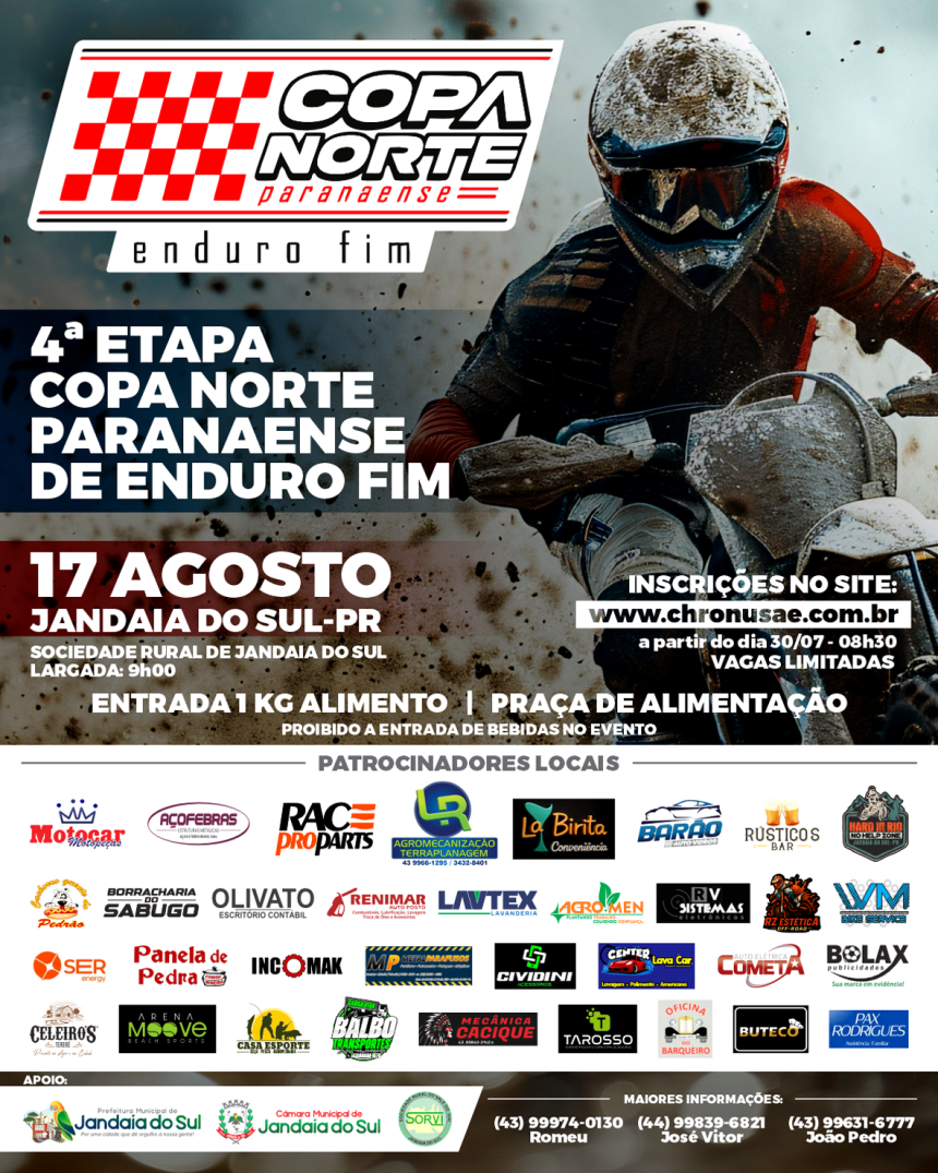 No próximo dia 17 de agosto, Jandaia do Sul será palco da 4ª etapa da Copa Norte Paranaense de Enduro FIM, um dos eventos mais aguardados do motociclismo off-road regional. A largada está marcada para as 9h, na Sociedade Rural de Jandaia do Sul, prometendo emoção, adrenalina e manobras radicais.