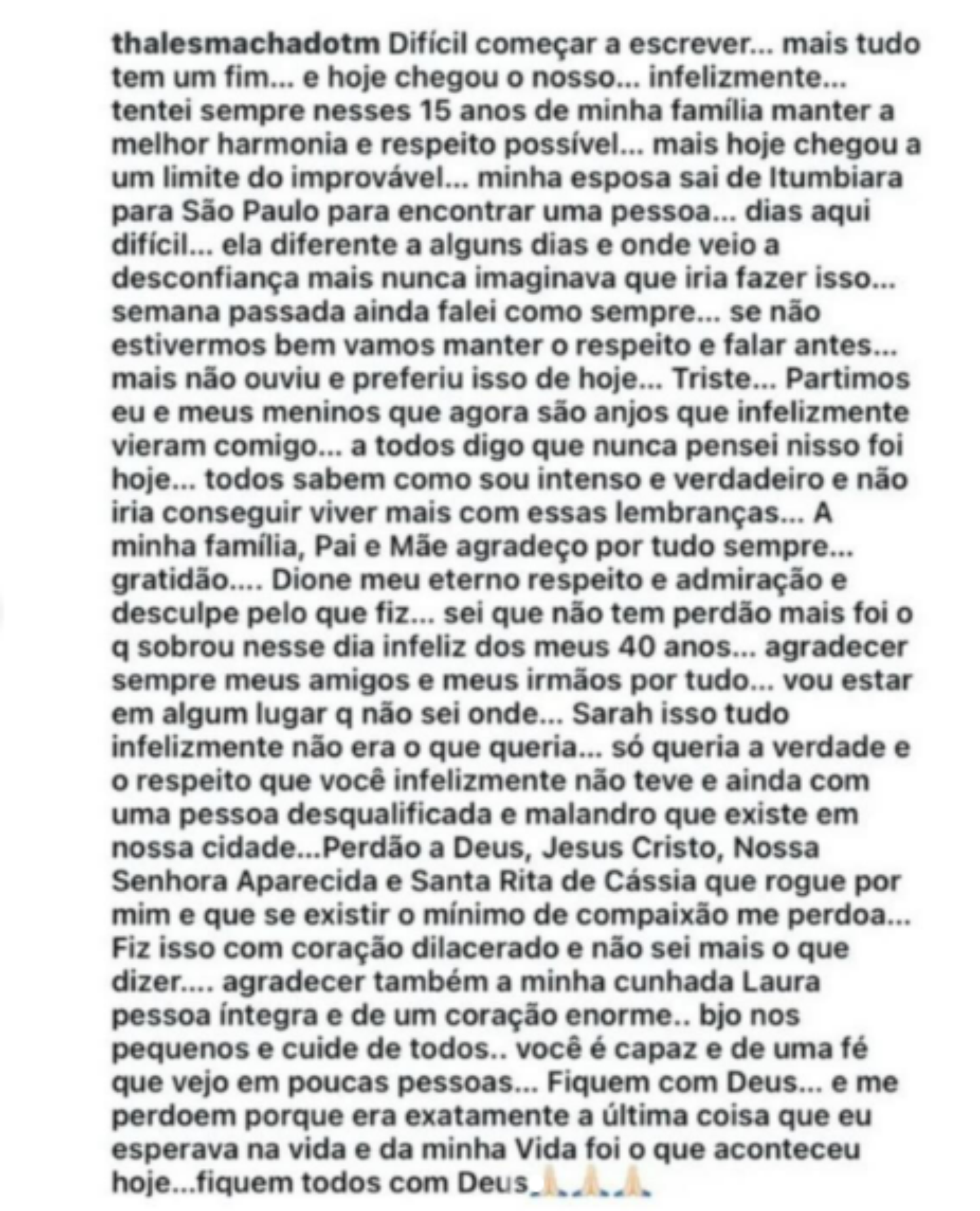 Horas antes da tragédia, o secretário havia publicado mensagens nas redes sociais demonstrando afeto pelos filhos. Ele também teria divulgado uma carta aberta, posteriormente apagada, na qual relatava conflitos familiares, dizia estar emocionalmente abalado e pedia perdão a familiares e amigos.