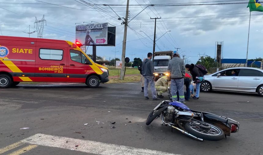 Um jovem de 20 anos ficou ferido na manhã desta segunda-feira (23) após se envolver em um acidente entre uma motocicleta Honda CG e um Ford Fusion, em Apucarana. A colisão ocorreu no cruzamento da Avenida Seixas do Amaral, no Parque Industrial Norte, local conhecido por registrar frequentes acidentes.