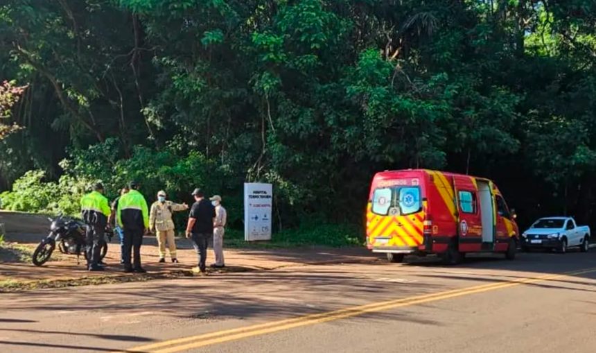 A colisão ocorreu em frente a uma unidade hospitalar, quando um carro, utilizado como táxi, tentou acessar a entrada do local e acabou atingindo uma motocicleta Honda CG 160, que seguia no sentido contrário.