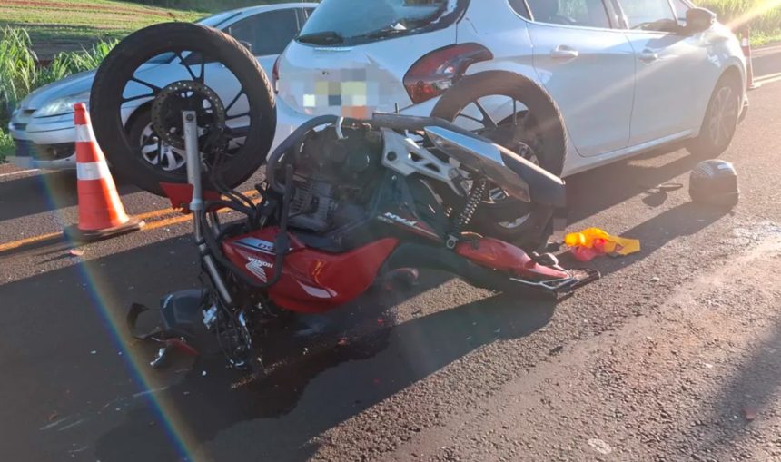 A colisão envolveu uma motocicleta Honda CG 160 Fan e um automóvel Peugeot 208.