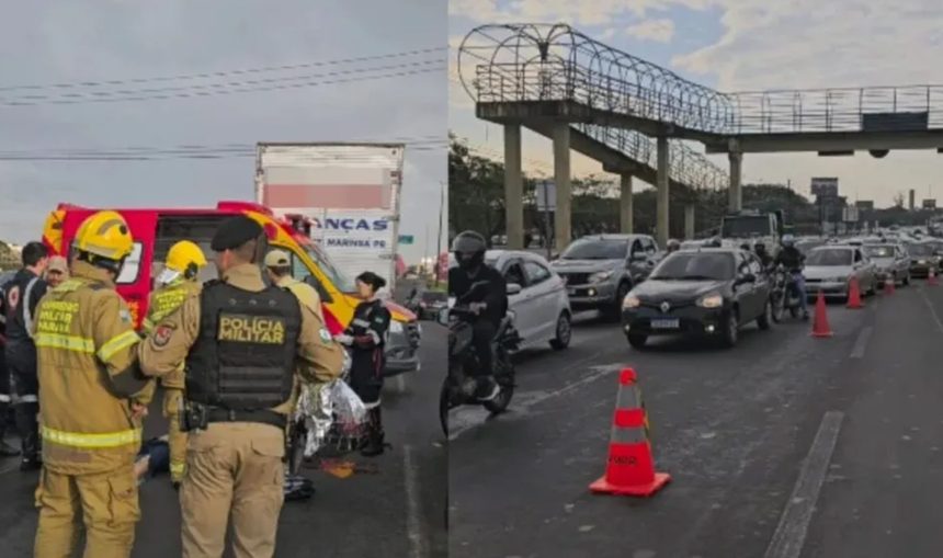 Um motociclista morreu na manhã desta sexta-feira (08) após ser atropelado por um caminhão na Avenida Colombo, em Maringá (PR). A ocorrência foi registrada nas proximidades do Parque de Exposições.