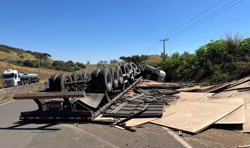 O acidente aconteceu pouco antes das 13h, na região conhecida como “serrinha”, antes da entrada de Califórnia, no sentido Marilândia do Sul–Apucarana. A carreta transportava placas de MDF, que se espalharam pela pista e acostamento.