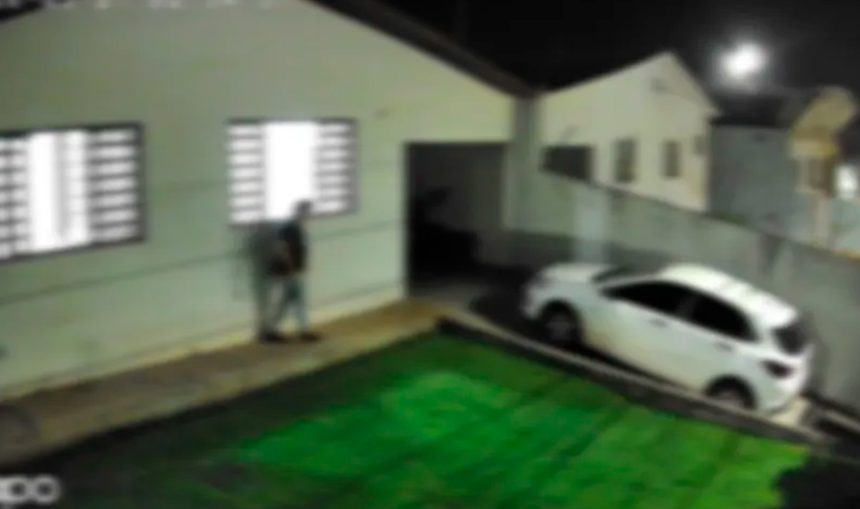 Imagens de câmeras de segurança registraram o momento em que o homem entra no quintal, observa o local e invade a casa, surpreendendo a vítima, que estava acompanhada de um amigo.